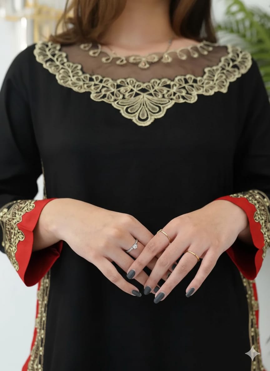 The AMBER 2piece set features a stylish black dress complemented by a plain trouser, designed for daily wear. Measuring 44 inches in length, it offers a flattering silhouette. Thread embroidery enhances the neckline and side chaka of the shirt, adding a touch of sophistication to casual attire.