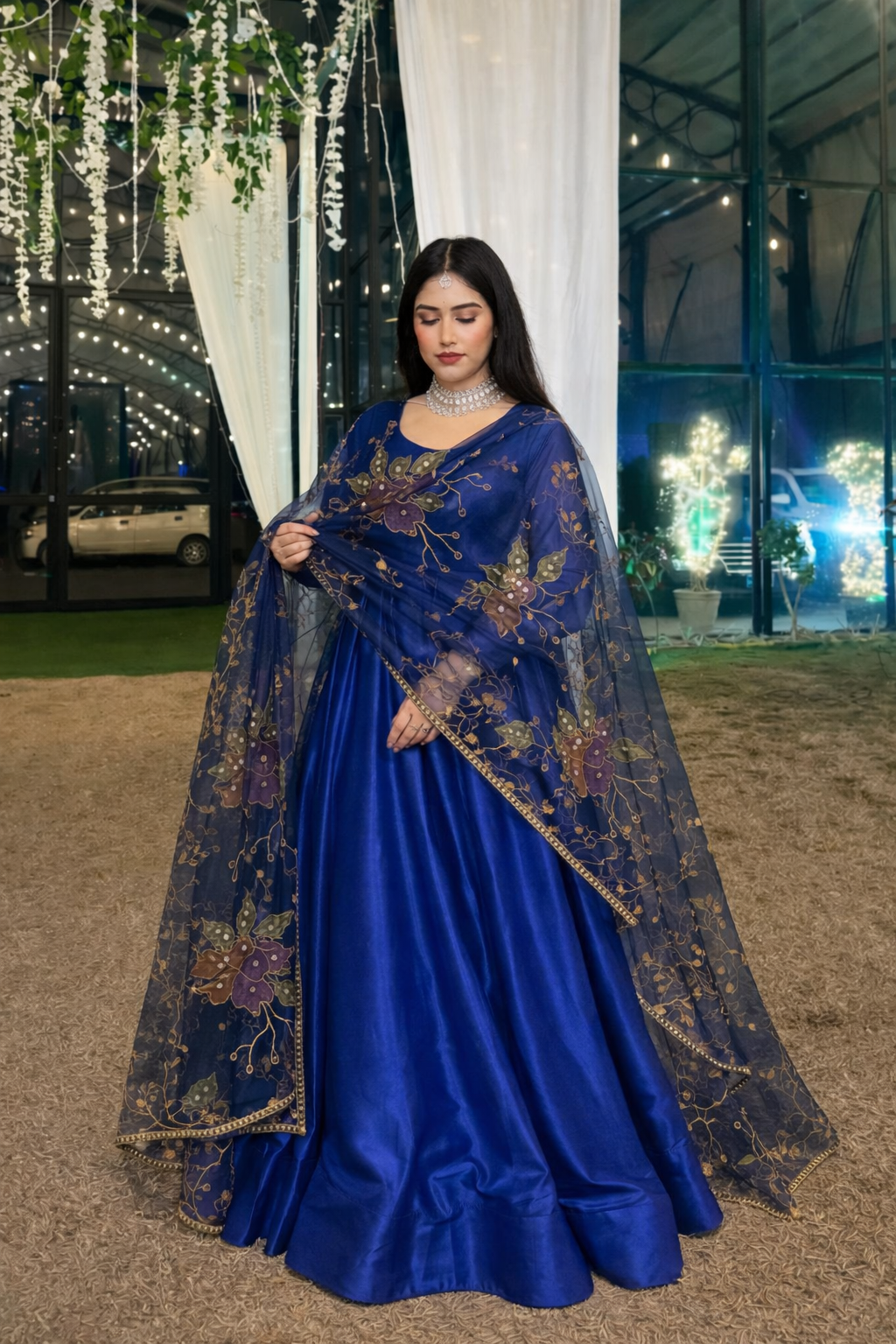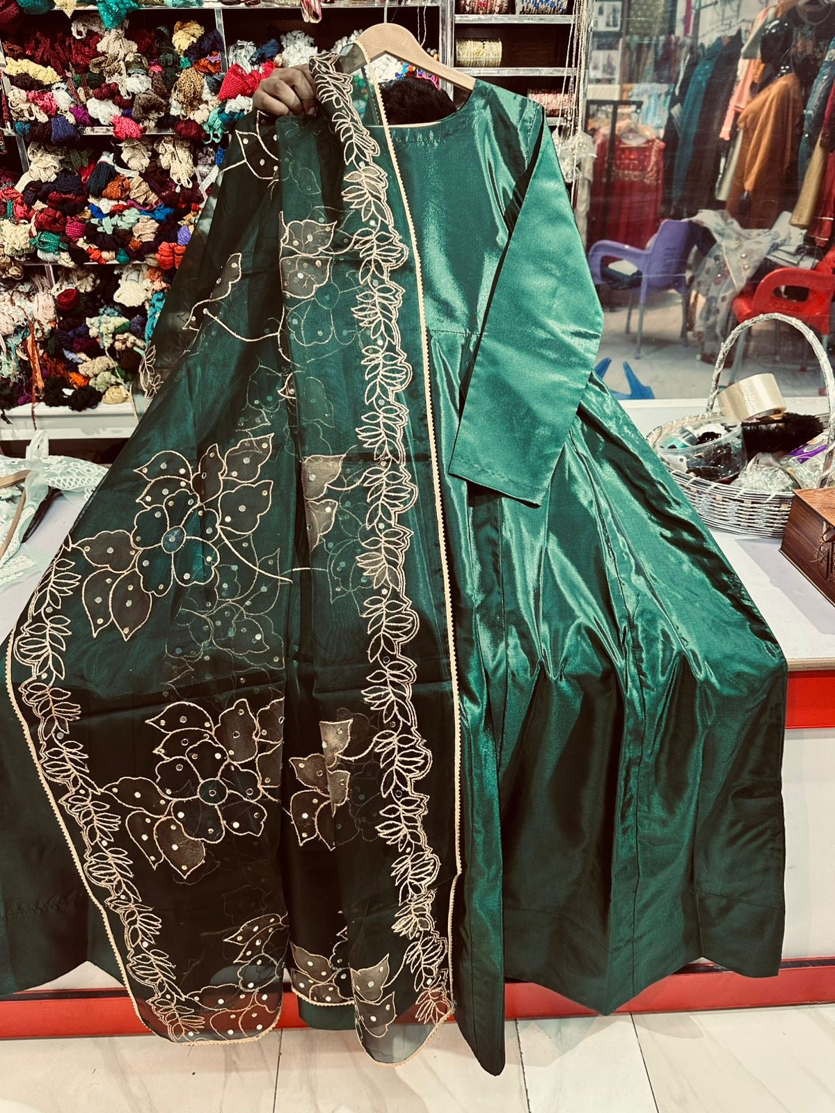 The MAYSHA SILK COLLECTION features a soft seesha silk long flair chair kalli dar with a 250-inch flair and a length of 53-55 inches. Accompanied by a hand-printed organza dupatta, this elegant ensemble offers tailored customization options, enhancing fit and personal style. Ideal for formal occasions, the collection combines sophistication with versatility.