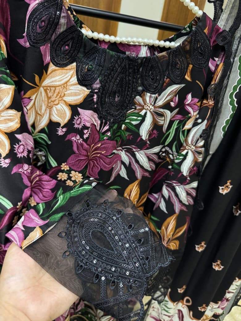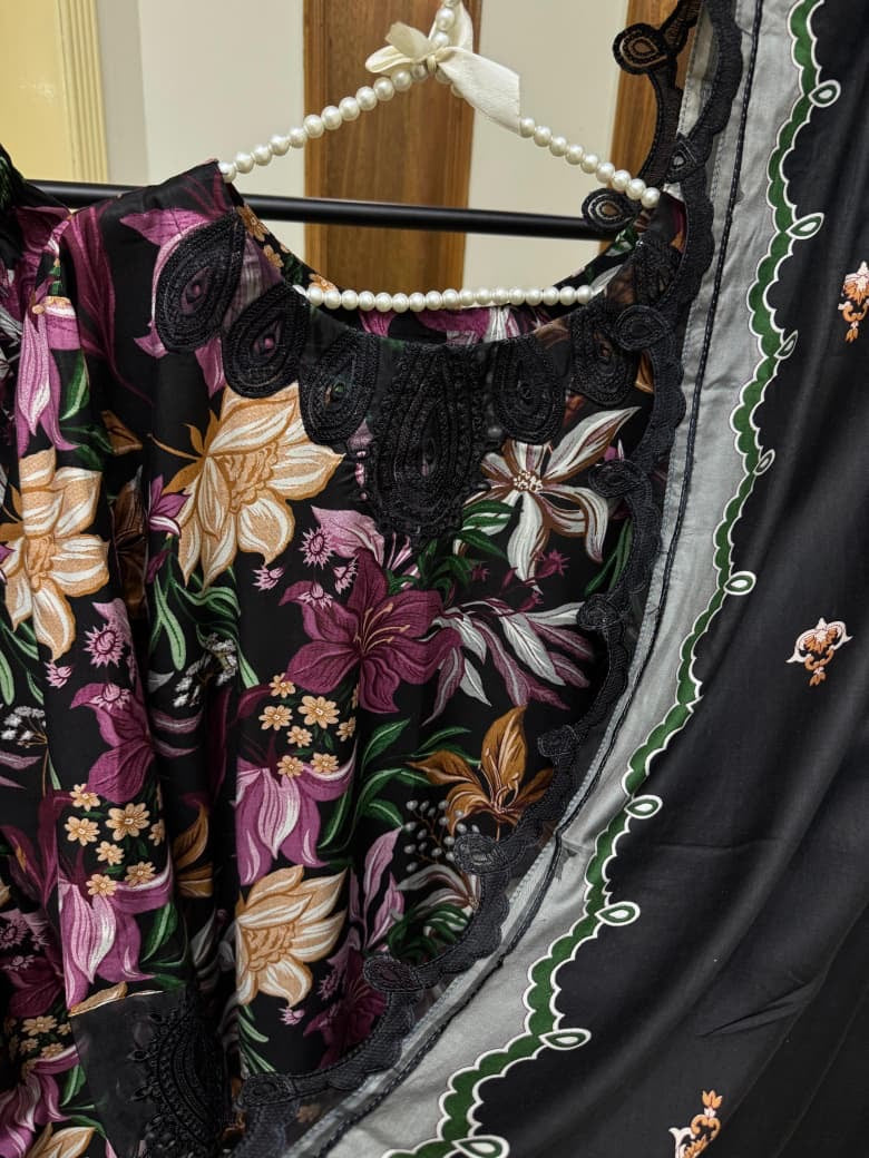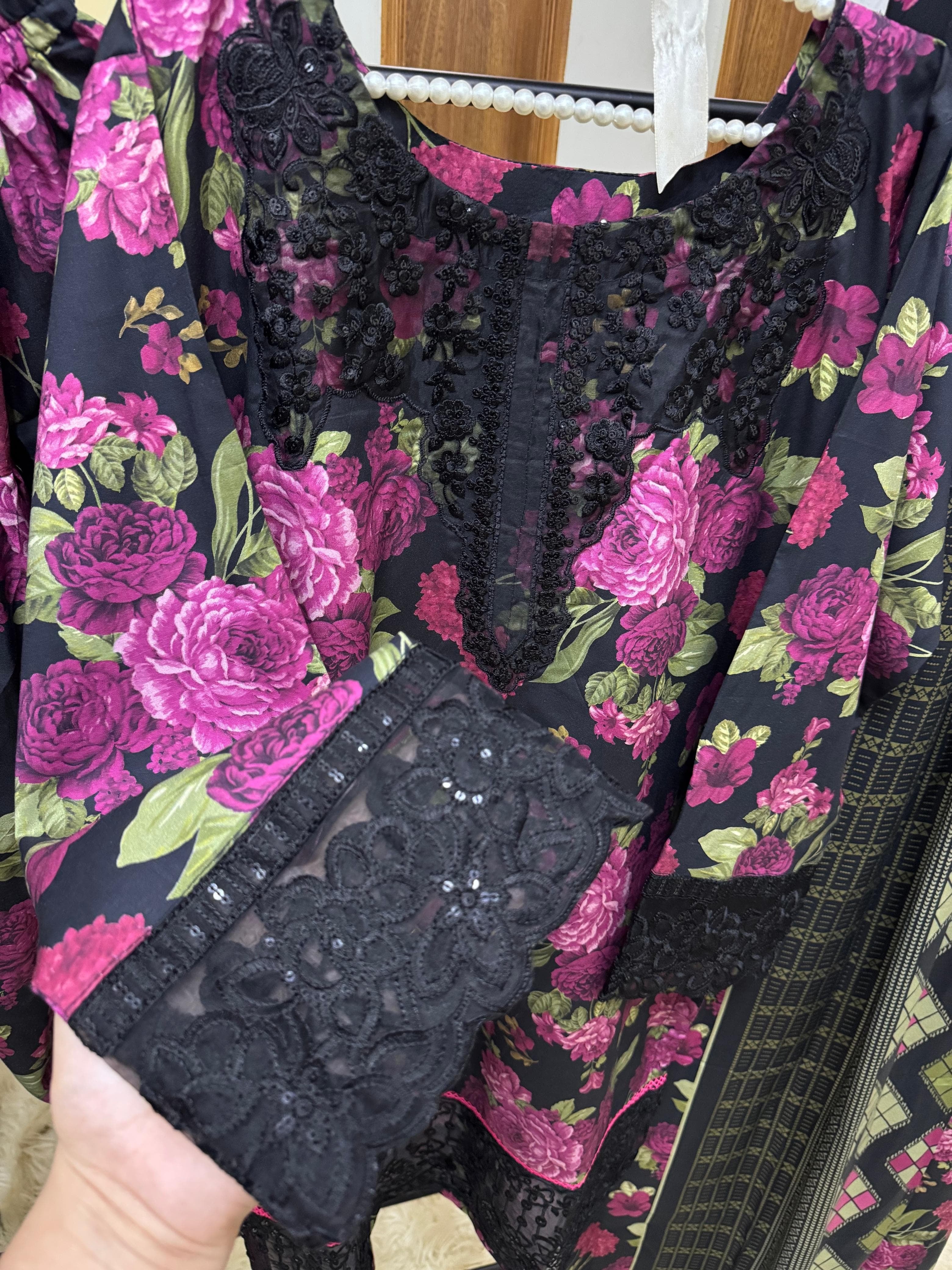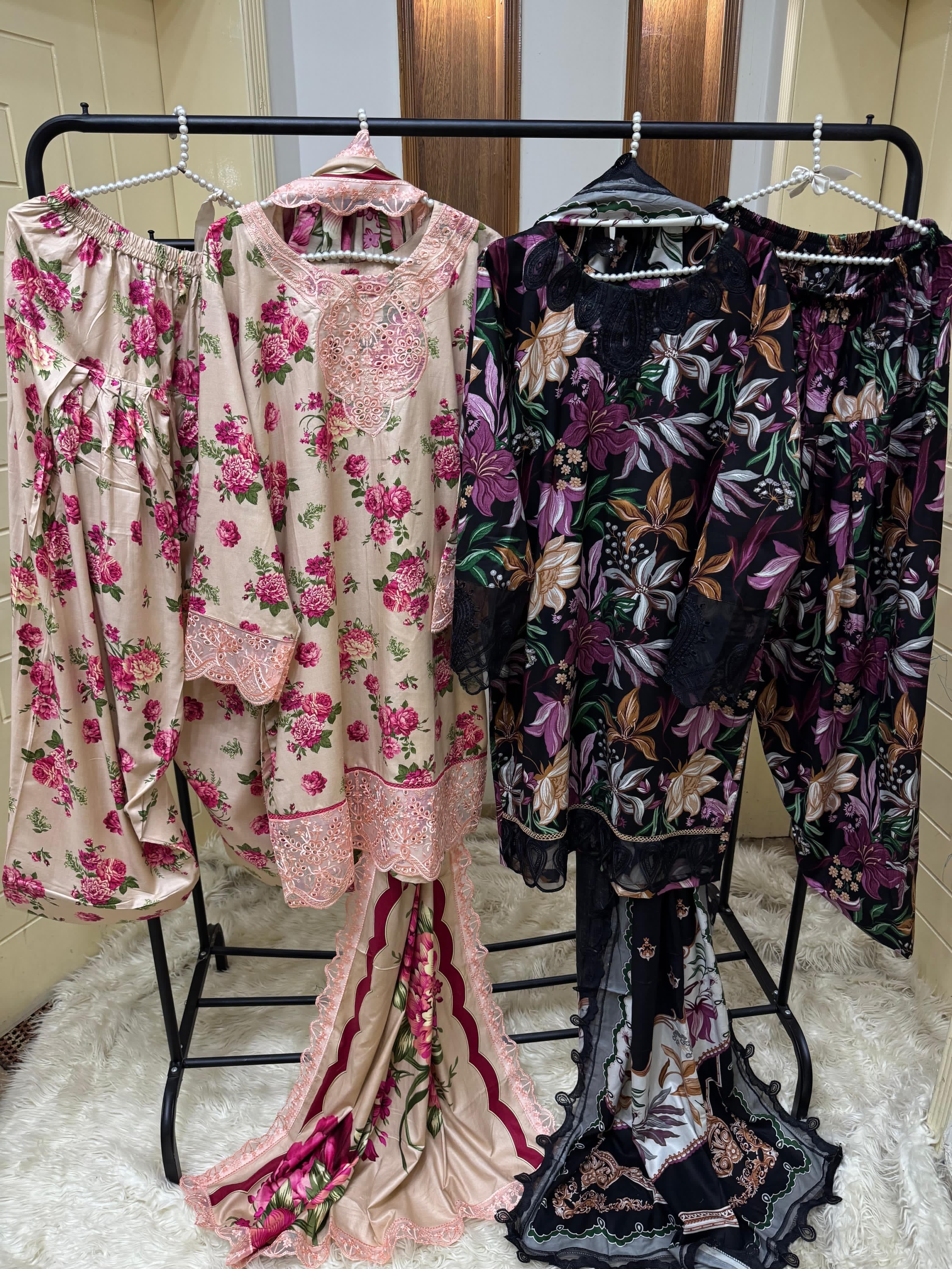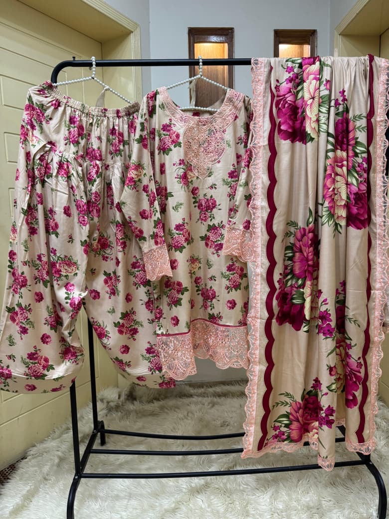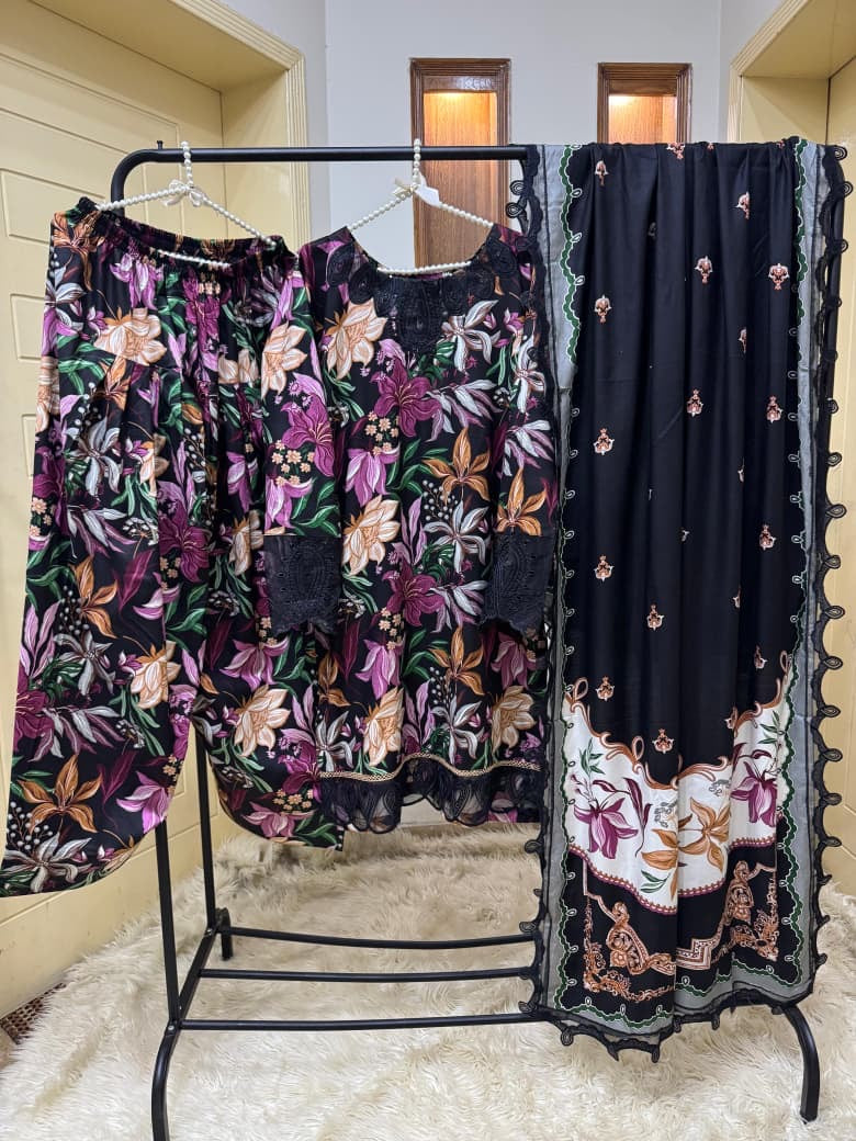 Upgrade your winter wardrobe with the MUSHK 3PC collection. Made from quality linen fabric, each piece is delicately embroidered for a touch of elegance. The neckline and sleeves are adorned with beautiful embroidery, while the farshi shalwar adds a unique twist. Complete the look with the digitally printed shawl for a stylish and cozy ensemble.