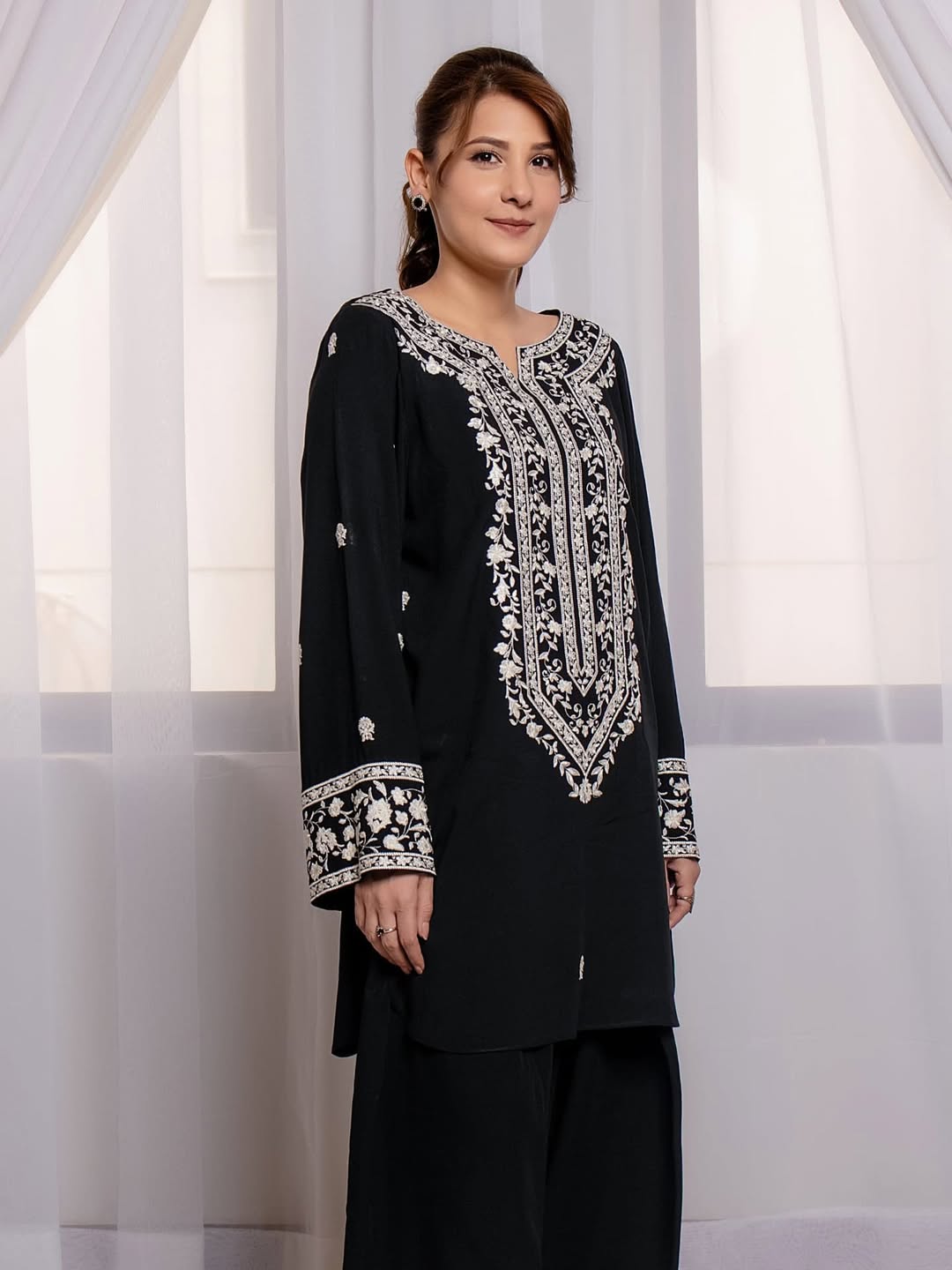 A timeless black outfit designed with grace and sophistication.